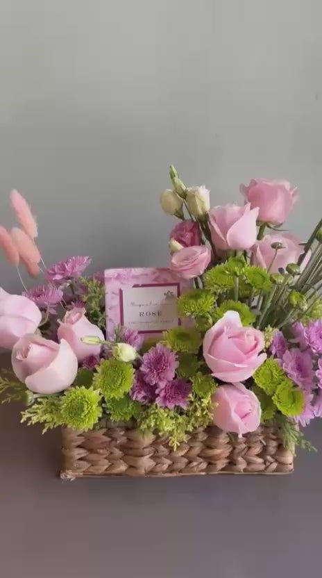Flowers Used: Sweet Pink Roses, Green Button Chrysanthemums, Pink Lisianthus, Pink Bunny Tail, Ribbon Grass and a hand-poured soy Rose Candle in a reusable jute basket.