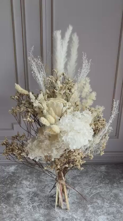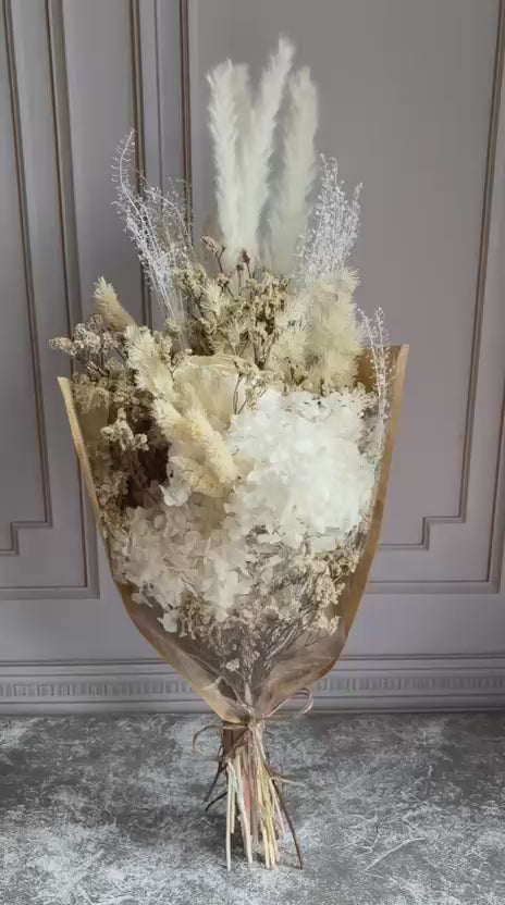 An all-white composition of fully dried botanicals, The Magnolia Preserve pairs cloud-soft hydrangea, feathery pampas plumes and delicate textural stems in layered tones of ivory and cream. Airy yet generous, the bouquet feels calm and timeless, designed to bring light into a space. A study in white drama, it offers enduring beauty that enlivens a space.